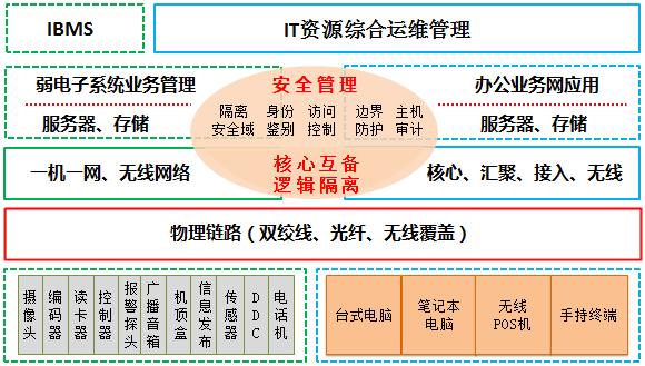 智簡網絡整體架構如圖所示,弱電系統IP網和辦公業務網基于統一的IP網絡平臺,各自組網、核心互備融合,實現后臺計算、存儲、安全資源的集中利用,通過安全邏輯隔離手段,保障業務系統的安全可靠和信息數據流向的訪問控制,建立基于全網的集中管理平臺。